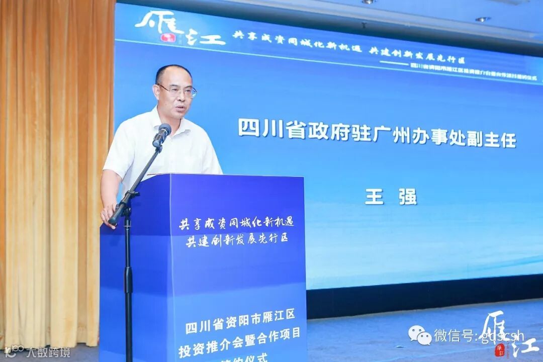 随后,我会常务副会长黄勇作为与会代表发言,介绍了我会的基本情况,及近几年我会返乡投资兴业的整体概况,资阳市雁江区位优势明显,他表示,非常愿意和商会企业家抱团到资阳、到雁江投资兴业,共享发展机遇,共创美好未来。四川省人民政府驻广州办事处副主任王强在讲话中对推介会的召开表示诚挚的祝贺,对出席会议的企业家和长期以来关心、支持雁江区与华南地区合作的各界朋友表示衷心的感谢。今日雁江已然成为服务质量好、办事效率高、发展成本低、社会环境优的投资洼地。热忱邀请各位企业家朋友到四川雁江投资兴业。