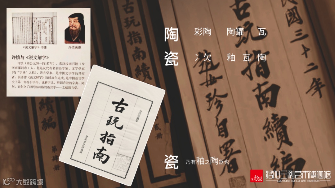 东汉时期,许慎著《说文解字》“瓷”字在洛阳创立,汉代许慎在《说文解字》一书中关于“陶”与“瓷”有如下记述:“陶,瓦器也;瓦,土器已烧之总名”;“瓷,从瓦次声。疾资切”。由此可知,汉代已将“陶”与“瓷”进行划分,两者具有同一属性,证实“瓷”是“釉陶”的总称,特指三彩。