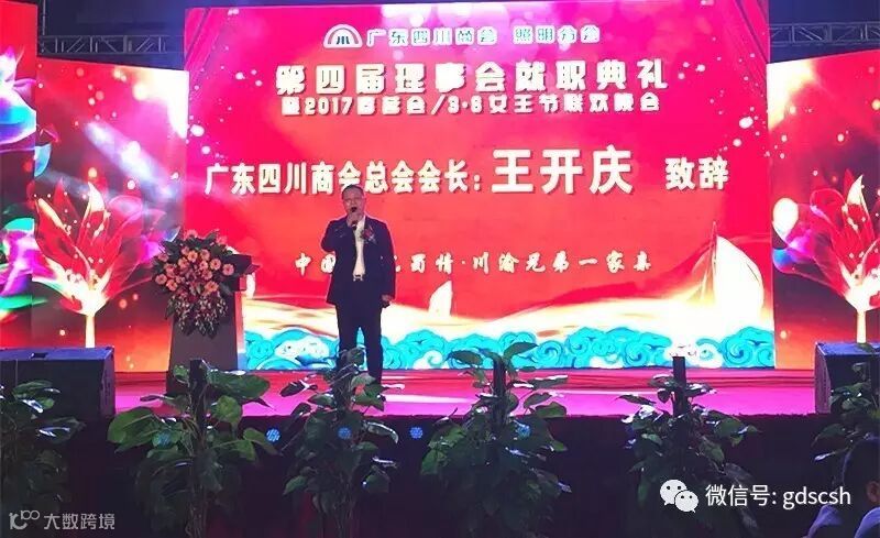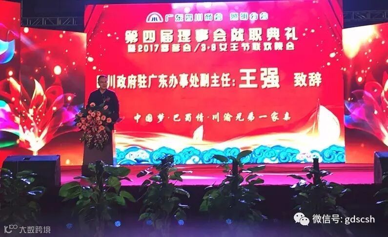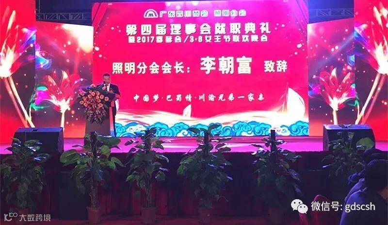 3月8日,我会照明电器分会第四届理事会就职典礼暨2017春茗会、3.8女王节联欢晚会在中山古镇国际路灯城隆重举行,来自珠三角地区的川籍企业家、商协会代表约800人出席了此次活动。四川省人民政府驻广州办事处副主任王强、我会会长王开庆、理事长朱曲波、监事长熊宗友、常务副会长杨永国、杜承坪、刘定杰、朱玉山,及各分会代表参加了此次活动。