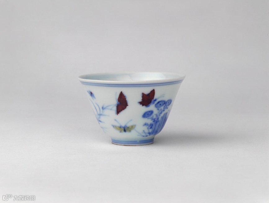 这是一只轻灵秀巧的斗彩瓷杯,洁白细腻、薄如蝉翼的胎体上绘了两只蝴蝶,在山石花草中蹁跹飞舞。值得注意的是,其中一些部位上所施的紫色彩釉色浓而无光。