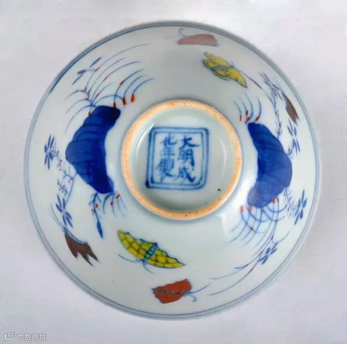 这对三秋杯高4.3cm,口径6.8cm,足径2.6cm,体量与鸡缸相差不多。底款是大名鼎鼎的“大明成化年制”六字,是著名的“婴儿体”。