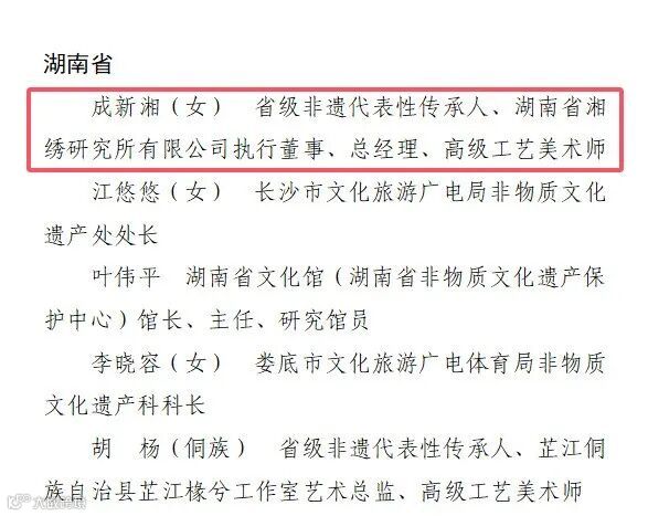 近日,文化和旅游部发布《关于表彰全国非物质文化遗产保护工作先进集体和先进个人的决定》,授予100个单位“全国非物质文化遗产保护工作先进集体”称号,授予198人“全国非物质文化遗产保护工作先进个人”称号。其中,湖南3家单位和6名个人荣获该称号,湖南省湘绣研究所执行董事、总经理成新湘获个人称号。