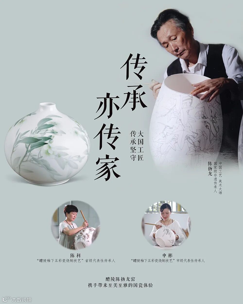 陈利,陈扬龙长女,1968年出生于醴陵陶瓷世家,陈瓷第四代传人。高级工艺美术师,湖南省级非遗代表性传承人,全国非遗先进个人,醴陵釉下五彩瓷核心工艺“薄施淡染”主要研究者和直接传承人。从事醴陵釉下五彩瓷工作30余年,多次获全国工艺美术最高奖“百花奖”,其六件作品被中国国家博物馆收藏。