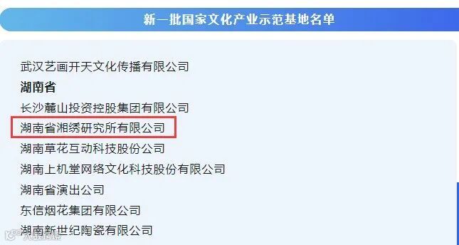 3月26日,文化和旅游部公布了新一批及通过复核的国家文化产业示范基地名单,219家企业被命名为新一批示范基地,165家现有示范基地通过复核。湖南省湘绣研究所有限公司入选新一批示范基地。