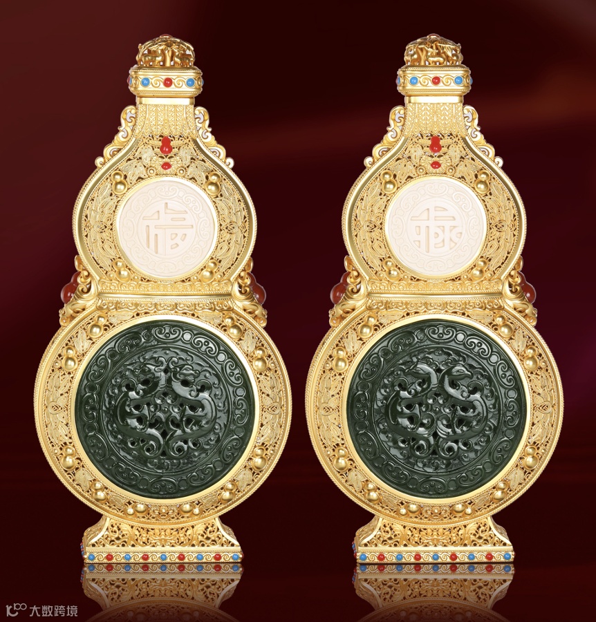 为推动非遗文化传承保护,让非遗“活”在当下,充分展现民族文化自信,中国文物交流中心授权推出“金玉盛世 大国传承”文物艺术品系列,其中系列首件作品《福禄泰瓶》特邀中国工艺美术大师程淑美(花丝镶嵌)、中国工艺美术大师李春柯(牙雕)、中国玉石雕刻大师孟庆东(玉雕)三位大师联袂担任设计创作,以八件国家一级文物为原型,推出代表我们这个时代的大国经典——《福禄泰瓶》。