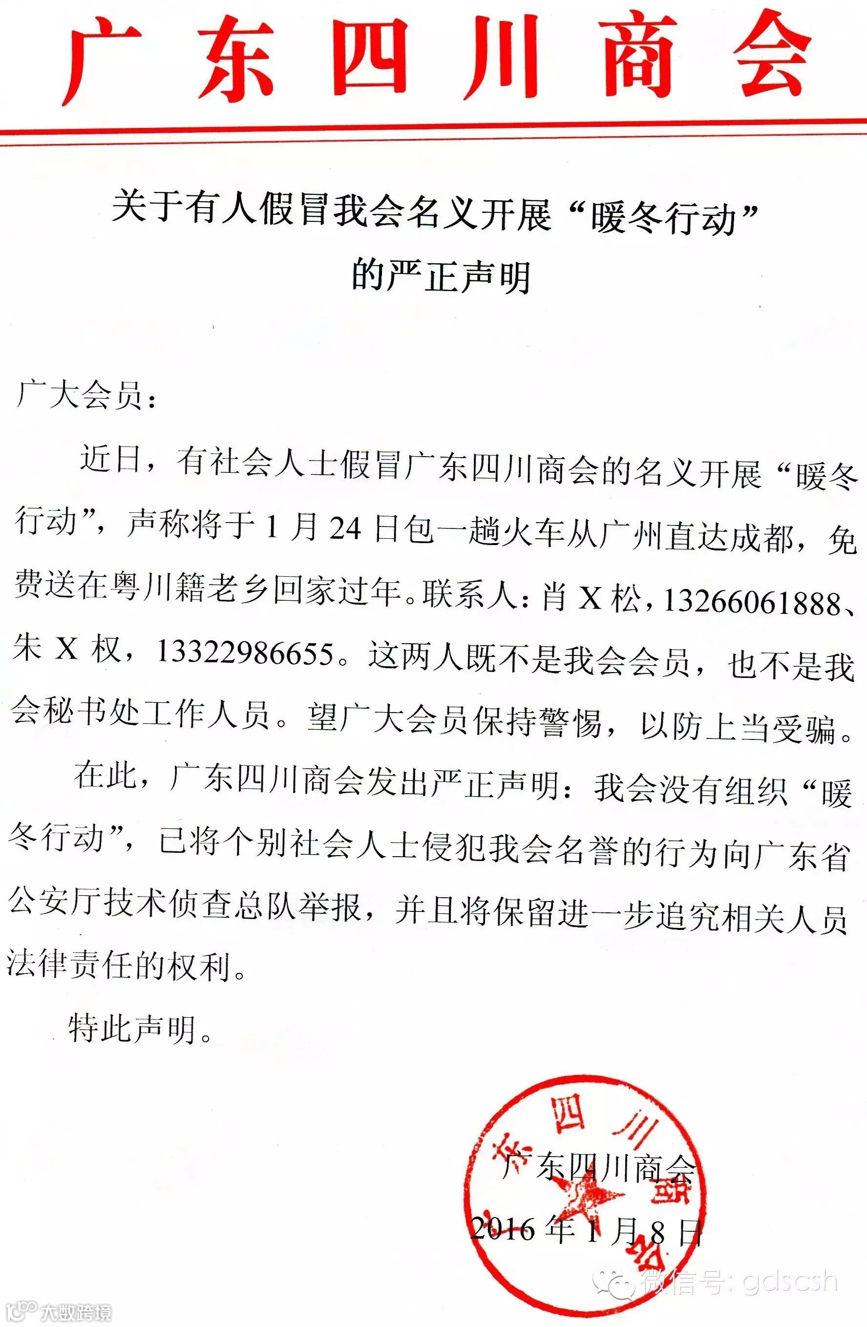 在此,广东四川商会发出严正声明:我会没有组织“暖冬行动”,已将个别社会人士侵犯我会名誉的行为向广东省公安厅技术侦查总队举报,并且将保留进一步追究相关人员法律责任的权利。
