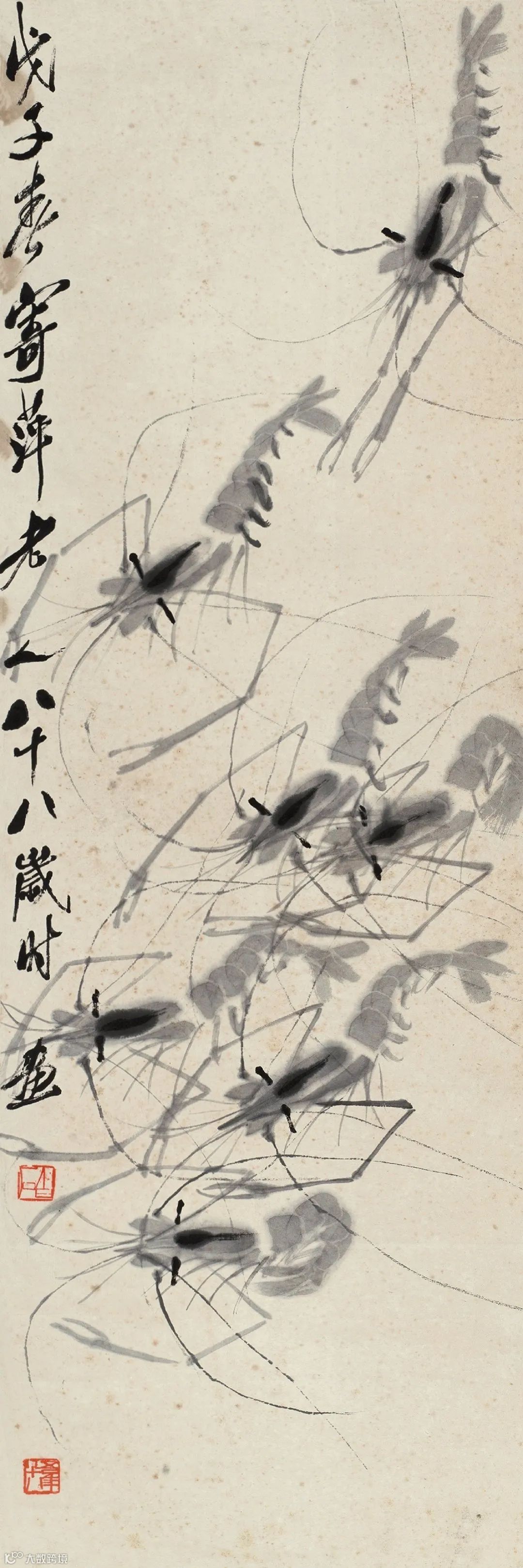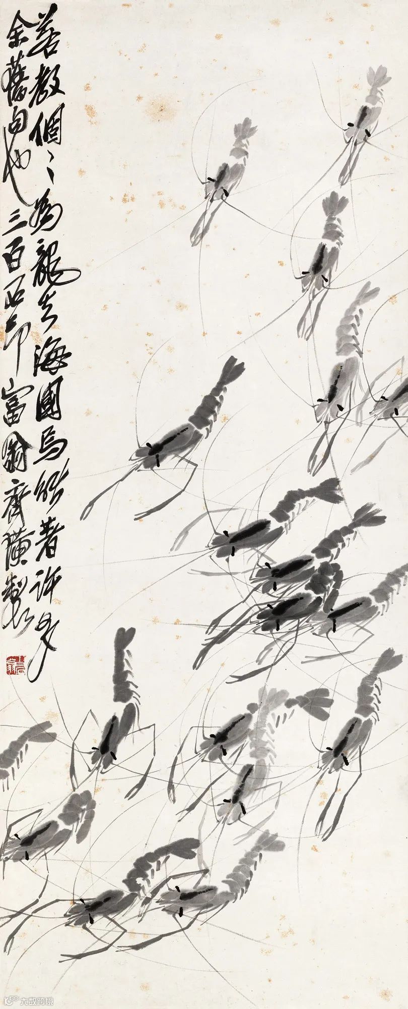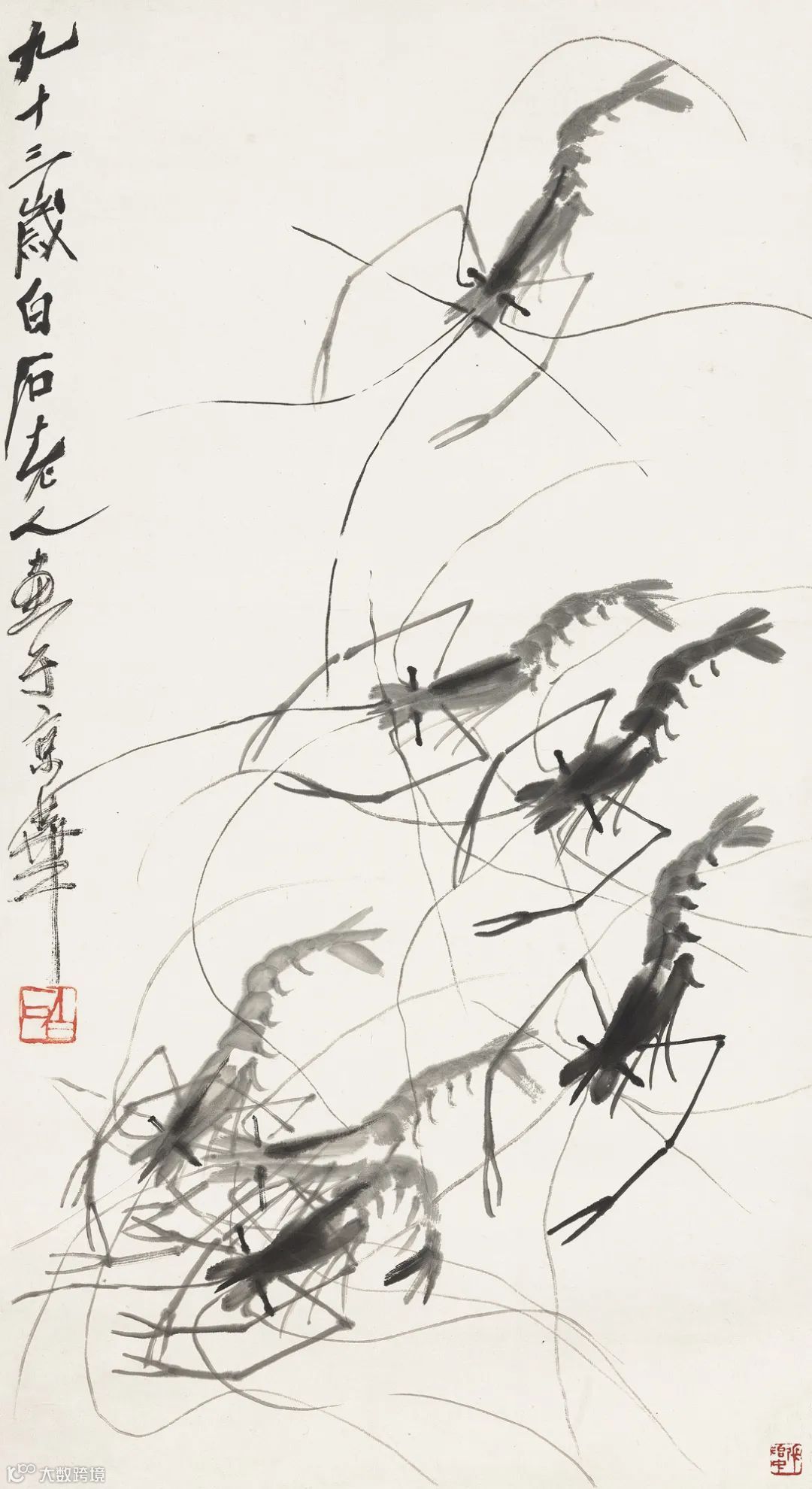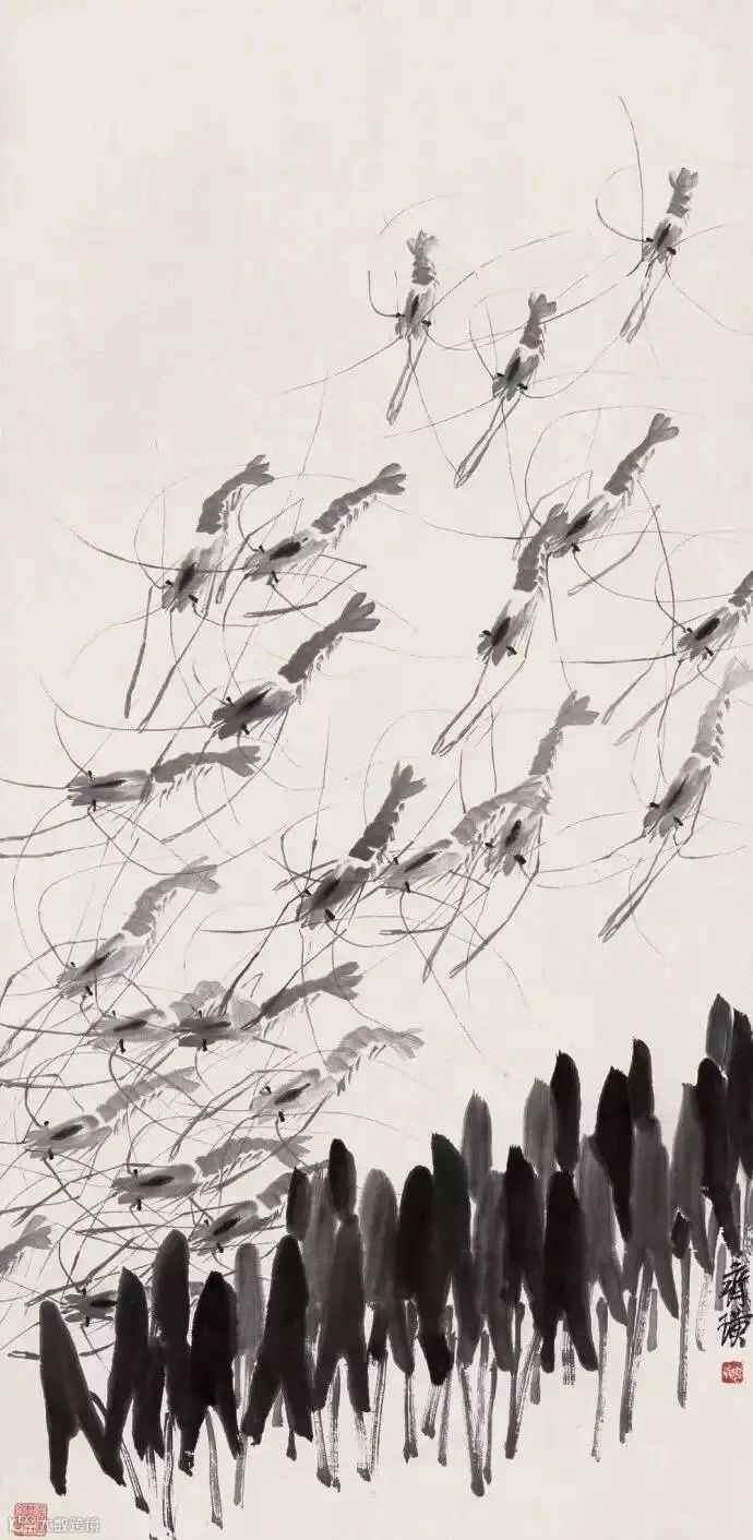 齐白石《群虾图》独树一帜,他用水墨创作虾、蟹、蛙等,不仅刻画出了它们跳跃争斗、飞翔鸣叫的生命活态,还展示出水墨艺术自身的奇妙与魅力。这种对生命的独特诠释,使他的作品充满了生命的活力和生机。