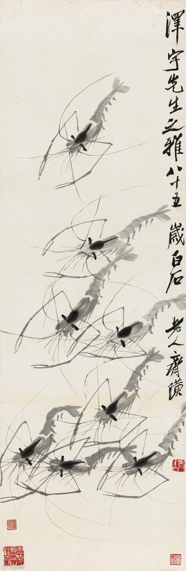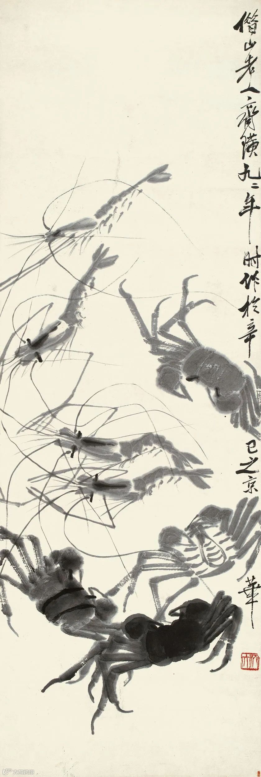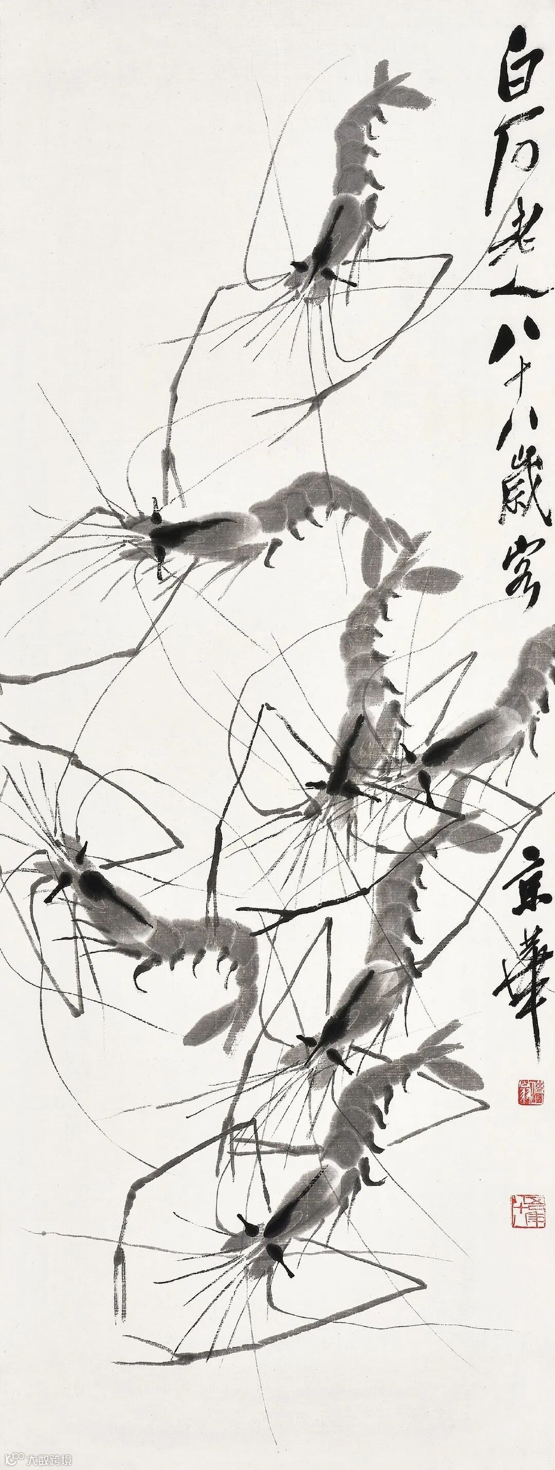 齐白石画虾时,既能巧妙地利用墨色和笔痕表现虾的结构和质感,又以富有金石味的笔法描绘虾须和长臂钳,使纯墨色的结构里也有着丰富的意味,有着高妙的技巧。