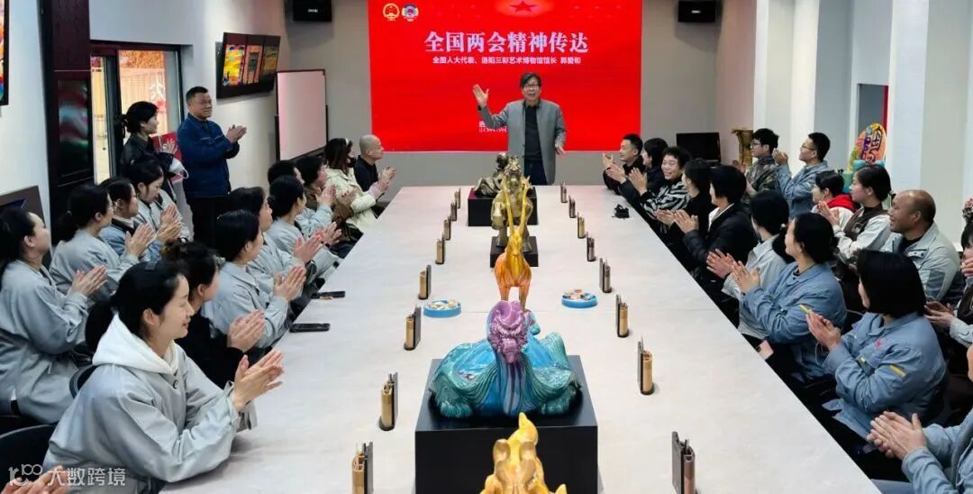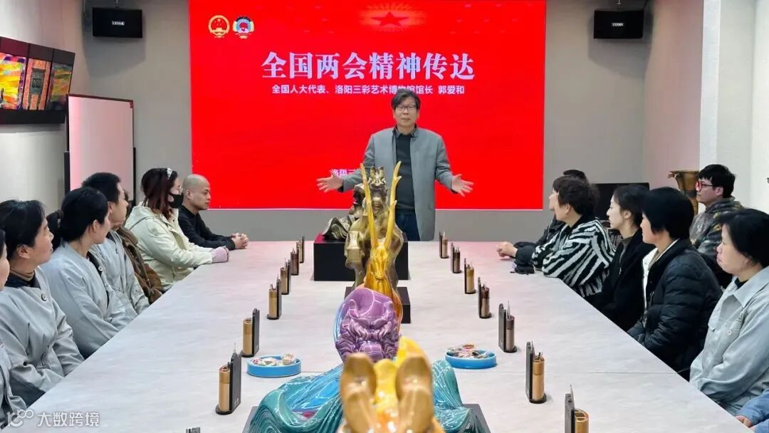 2024年3月13日,郭爱和馆长在两会结束返洛后,第一时间向洛阳三彩艺术博物馆全体职工传达两会精神,对政府工作报告中的“推进国家文化数字化战略”、“提高公共文化场馆免费开放服务水平”、“大力发展文化产业”、“加强文物系统性保护和合理利用,推进非物质文化遗产保护传承,深化中外人文交流,提高国际传播能力”进行深度解读。