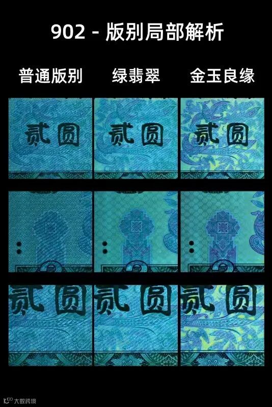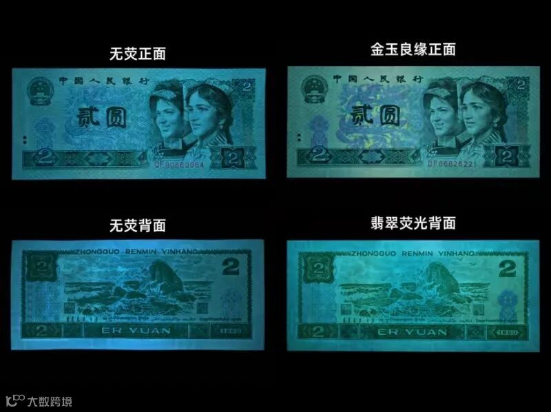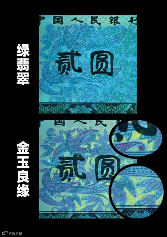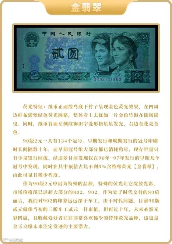 其次,不知道大家知道不知道,现在的【荧光品种】在过去那个时代下,都只是为了去实验防伪技术而执行的,目前我们认为,在96年开始印刷90版贰元时,印钞厂开始试验【正背周边纹路中加入荧光剂】,从而形成【绿翡翠-防伪荧光】。在96年7月份开始印刷的D冠中,印钞厂又开始实验“授鸟下的底纹加入金荧光剂”形成一种新防伪荧光,也就是我们现在发现的“金翡翠”这个防伪标准,并且其中【DP8682】流水中约有一千张纸币,我们认为或是在印刷油墨中加入过多荧光剂或者印刷时喷墨剂量偏多,导致出现的满版强荧光的防伪版本,也就是现命名【金玉良缘】的荧光版本。