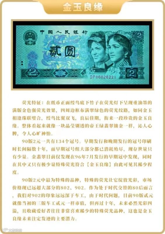 90版贰元一共有多少个冠号?134个冠号。早期发行和晚期发行的冠号印刷时长间隔数十年,而早期冠号组大部分都已消耗殆尽,现存世只有少量的银行回流。而在早期印刷的数个冠号中,只有十二三个冠号流水存在绿翡翠,其中只有四五个冠号中的部分流水存在【金翡翠】。同时在稀少的金翡翠流水中又发现【DP8682】流水中有一千左右的纸币,出现满版强金光的特殊版本,就是【金玉良缘】。总而言之,就是少之又少,大家现在清楚【金翡翠、金玉良缘】有多少量了吗?