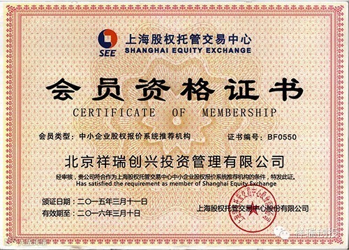 北京祥瑞创兴投资管理有限公司系上海股权托管交易中心会员单位,具有企业上市挂牌推荐资格,并与全国中小企业股份转让机构和多家创业投资公司密切合作。公司借助资本市场平台,为广大中小微企业提供场外资本市场挂牌上市服务,进行投融资和股权交易,并为挂牌企业提供相关后续服务和其他专业支持。