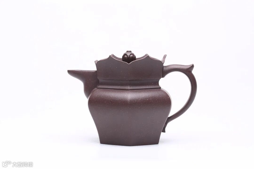 合菱是众多筋纹器中的一款,壶身立面菱形,上下对称,通体呈曲线之美,令人赏心悦目。纵线分割为六个等分菱花瓣,壶身腰部以菱花波线分割,似平静起伏的水浪,颇有动感。壶盖上置一莲钮。壶钮与壶身均是由上下相间的筋纹花瓣咬合而成,含苞待放。壶盖同样是六瓣花瓣造型,筋纹沟壑深深,刻意表现出筋纹特有的凝重感,从而凸显出花瓣的肥硕。整个壶身是由六瓣花瓣上下镶接而成,分布均匀,其中两瓣分别胥出壶流和壶柄。流和把采用素面造型,嘴头尖尖且修长,很是锋利,飞把同样气势挺峭,钢骨尽现。