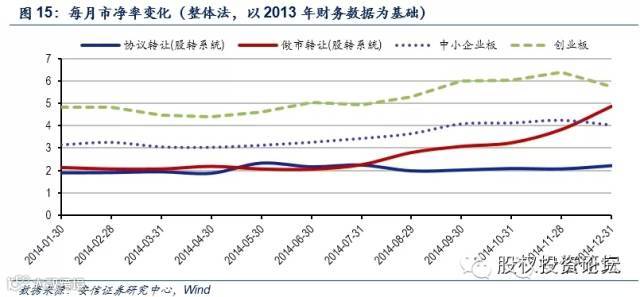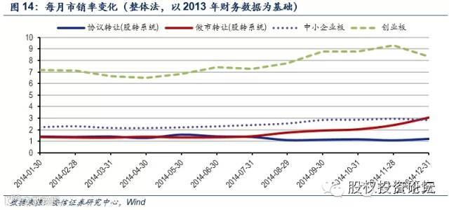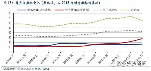 做市转让部分市盈率2014年8月份开始提升明显,12月已达27.75倍,高于协议转让部分72%,协议转让部分市盈率维持在13-18倍之间。