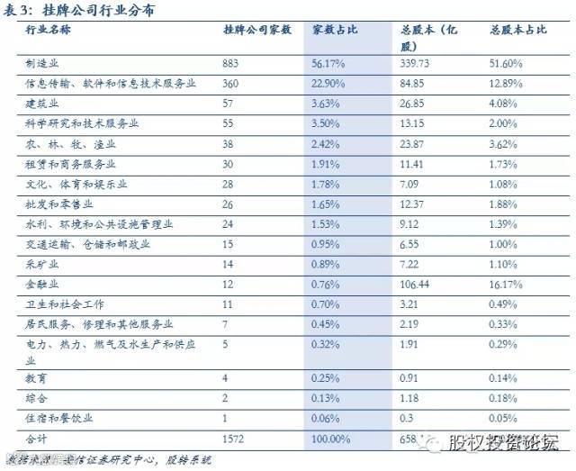 2014年三板企业中制造业占比56.17%、信息传输业占比22.9%,二者合计近80%。