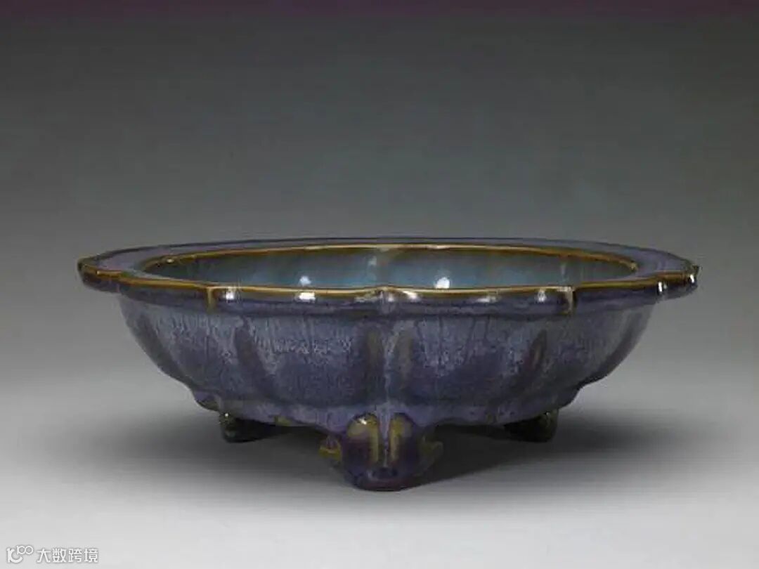 图:钧窑玫瑰紫釉菱花式三足花盆托