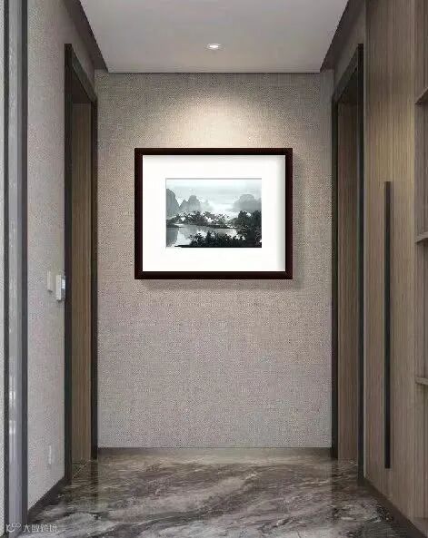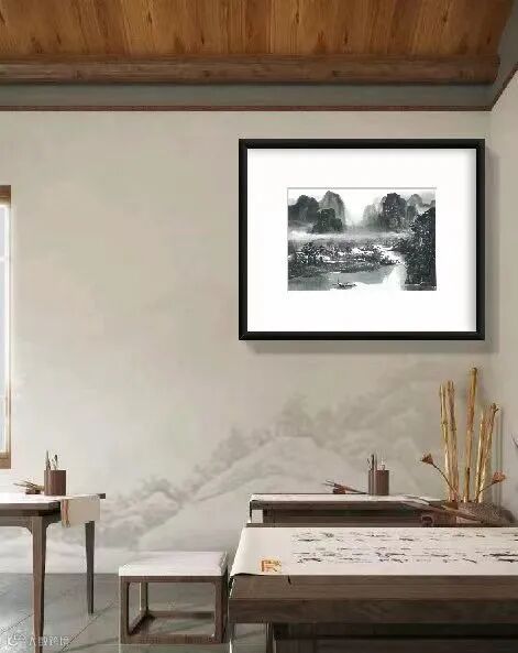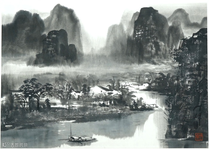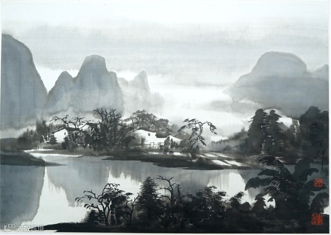 ·墨色由近及远,焦重浓淡清,墨分五色的变化体现其中,传统水墨晕染的基础上,光影加入后产生一种微妙的视觉感受,画面中朦胧的光影洒在房屋与水面上,迷蒙的光晕,虚实结合,独具特色的笔墨描绘着水乡的建筑与树木,似乎使观赏者看到了传说中的世外桃源。