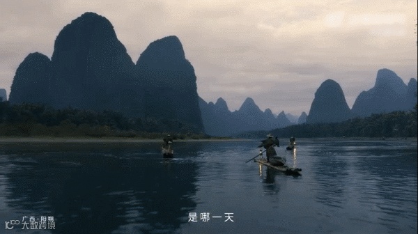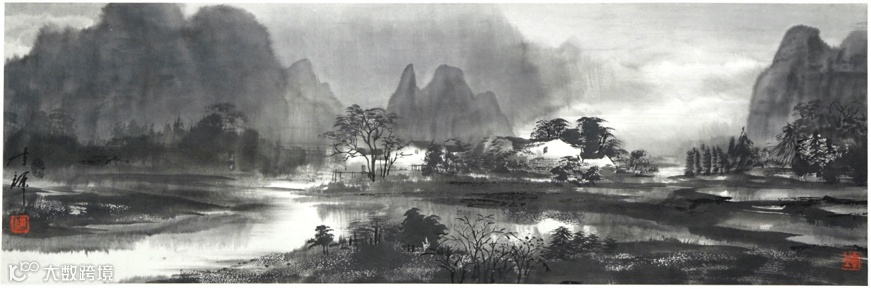 ·群山、沙溪、屋舍人家、组合勾勒出云雾缭绕的青峰翠屏和碧水萦回的漓江画面。