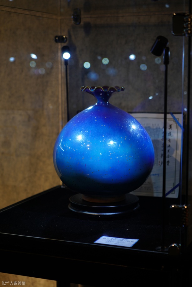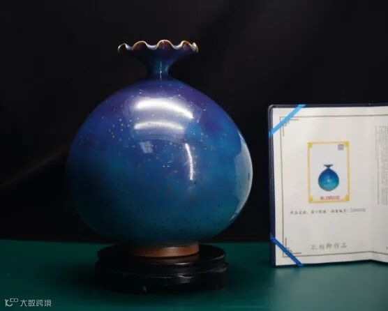 胆式瓶直口,长颈,削肩,腹下部丰满,器形似胆,故名胆瓶。此件钧窑作品造型别致独特,瓶口以荷叶造型仿生勾勒,既与自然相呼应也寓意美好,荷即”合",有合和平安之意,瓶颈处收窄,精巧细腻,瓶肚胆瓶丰满圆润,整体器型线条流畅,凹凸有致、大肚能容。瓶身通体施以铜系青蓝釉,经高温窑变后,自然肌理得出美丽的成色,观赏瓶身釉色如清澈透丽的蓝天,如深邃美妙的大海,如漂亮美丽的羽衣,如纯美无暇的松石兰与松石绿。