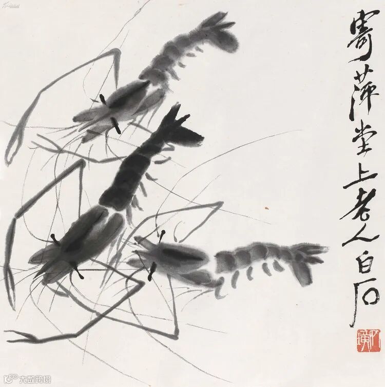 齐白石画虾可说是画坛一绝,灵动活泼,栩栩如生,可以说虾已经成为齐白石代表性的艺术符号之一,他一辈子都在研究怎么把虾画好,画出神!