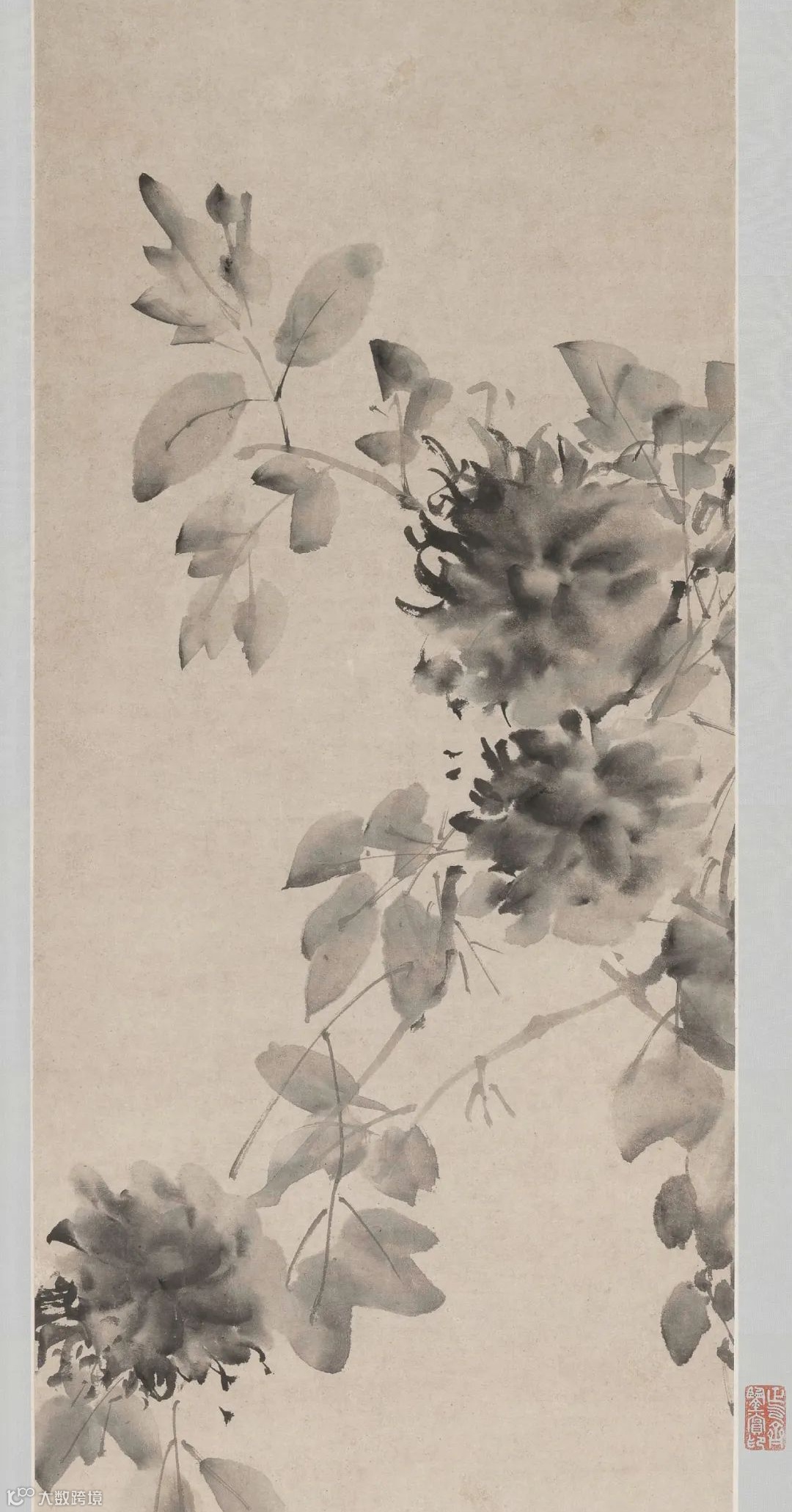 徐渭为明代著名画家,是中国“泼墨大写意画派”创始人、“青藤画派”之鼻祖,对后世画坛影响极大。这幅《水墨牡丹图》就是徐渭代表作之一,也是我国知名的写意牡丹花作品,现收藏于故宫博物院。整幅作品无论布局、笔墨,均泼辣豪放,气势逼人,立意鲜明,水墨润泽,极有生意。虽是水墨画成,却有富贵庄严之相,为水墨牡丹画经典作品之一。