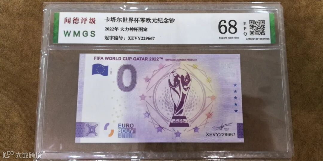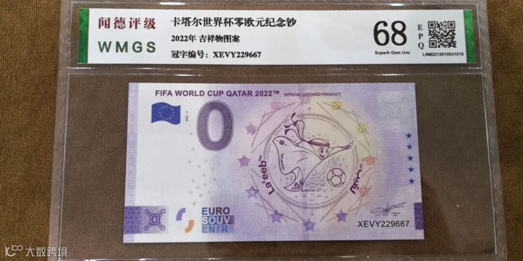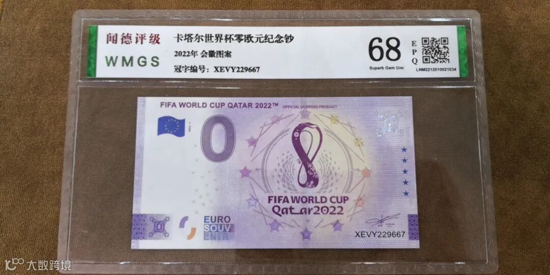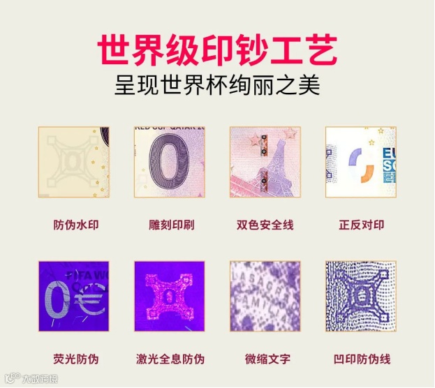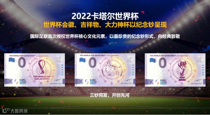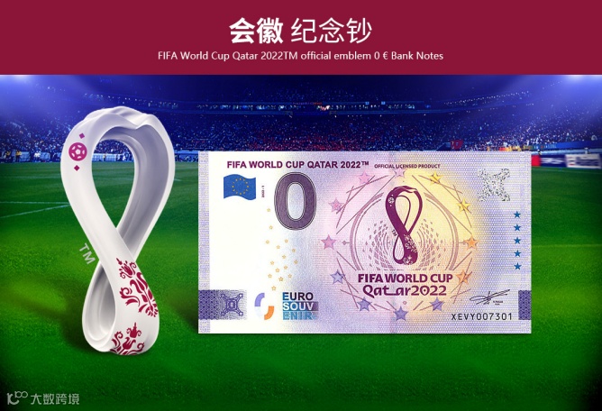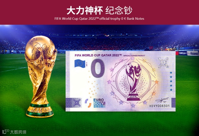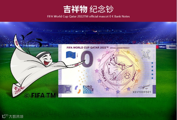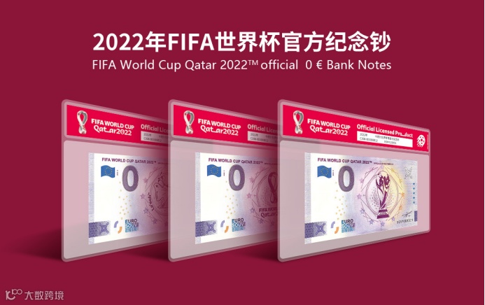为纪念2022年第22届世界杯足球赛在卡塔尔成功举办,国际足联(FIFA)联合欧洲中央银行特别发行《2022年FIFA世界杯官方纪念钞》一套3张,含会徽纪念钞、吉祥物纪念钞和大力神杯纪念钞各1张。均属于法定货币,全球总发行量20000套。