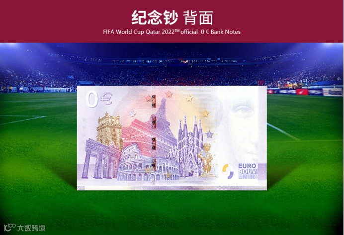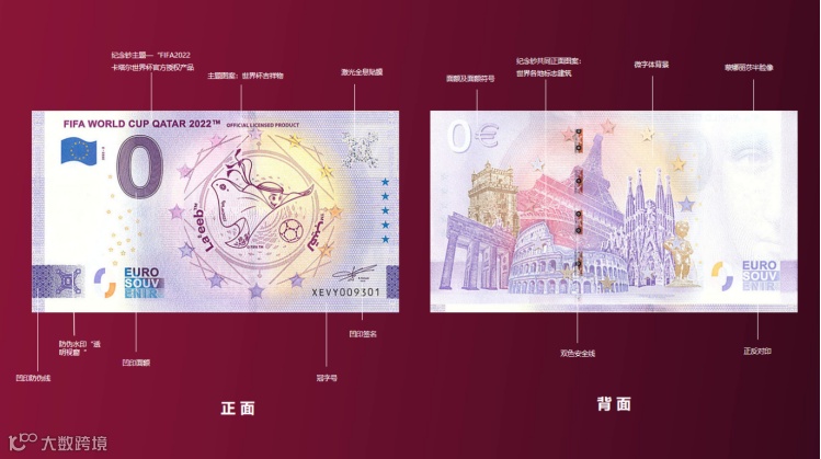 正面主景分别为卡塔尔世界杯官方会徽、吉祥物和大力神杯,上方为“FIFA2022卡塔尔世界杯官方授权”英文字样;左侧为面额数字“0”,右侧为激光全息贴膜、透明视窗,0欧元纪念钞创始人理查德·法耶Richard Faille签名及冠字号码。