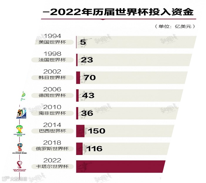2022卡塔尔世界杯也被堪称“史上最贵”世界杯!为了办好这届世界杯,东道主卡塔尔已经花掉超过2200亿美元,几乎相当于此前7届世界杯费用之和的5倍!如此大的投入,期待卡塔尔定能带给我们前所未有的惊喜。