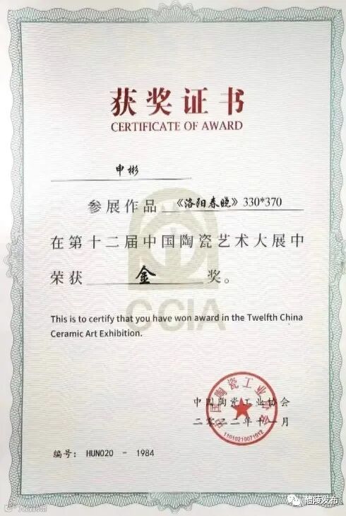 近日,我们陈扬龙窑艺术总监申彬的作品《洛阳春晓》在第十二届中国陶瓷艺术大展中喜获金奖。