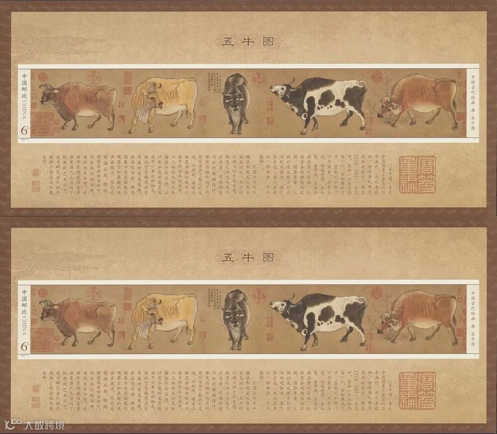 如果说中国古代书画作品如同浩瀚星河,那么《五牛图》就是这段历史中璀璨的恒星。将古画以邮票形式珍之、藏之,方不负此等美景。《五牛图》赏析册正是对《五牛图》这一经典的延续与致敬,它让更多的人走进《五牛图》、走进中国历史,了解韩滉、了解他所处的时代。《五牛图》系列产品,通过不同的产品将几千年的历史文化积淀呈于方寸天地之间,让您透过邮品感受到《五牛图》以及中国古代绘画的魅力,致敬经典、集邮会友。
