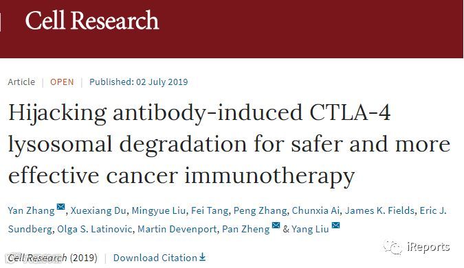 2019年7月2日,Cell Research 在线发表了来自美国马里兰大学医学院刘阳/郑盼教授联合实验室在此领域的最新研究成果“Hijacking antibody-inducedCTLA-4 lysosomal degradation for safer and more effective cancer immunotherapy”,揭示了CTLA-4抗体产生免疫副作用的全新机制。