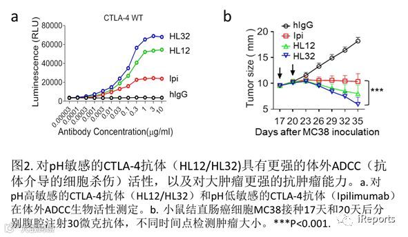 通过pH敏感性改造后,不安全的CTLA-4抗体变得安全了,那么是否影响了关键的抗肿瘤效果呢?如图2所示,研究人员发现pH敏感性改造后的抗体通过保留细胞表面的CTLA-4分子,增加了抗体介导的细胞杀伤作用,即更加有效的通过CTLA-4抗体介导的细胞杀伤或胞吞作用(ADCC/ADCP)选择性删除肿瘤微环境内高表达CTLA-4分子的调节性T细胞(Treg),进而增强机体对大肿瘤的抗肿瘤效果。通过pH敏感性改造后不仅减少了免疫相关的副作用,抗肿瘤效果也有一定程度的增加,可谓“一石二鸟”。