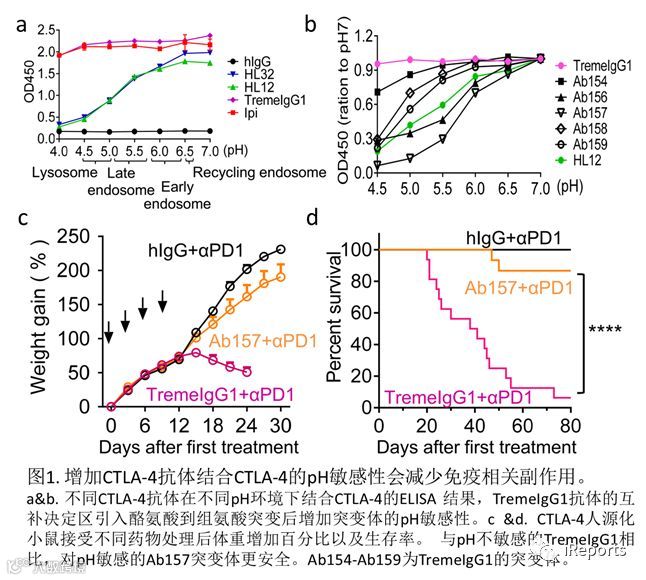为了让不安全的CTLA4抗体变得更加安全,研究人员改造了副作用更强的TremeIgG1抗体,得到了具有不同pH敏感性的突变体。如图1b-d所示,研究人员通过将TremeIgG1抗体的互补决定区CDR的酪氨酸Y突变成组氨酸H,成功地增加了TremeIgG1抗体的pH敏感性,阻止了抗体诱发的CTLA-4分子的溶酶体降解与下调,进一步的动物实验也表明改造后的抗体显著减少了免疫相关的副作用。