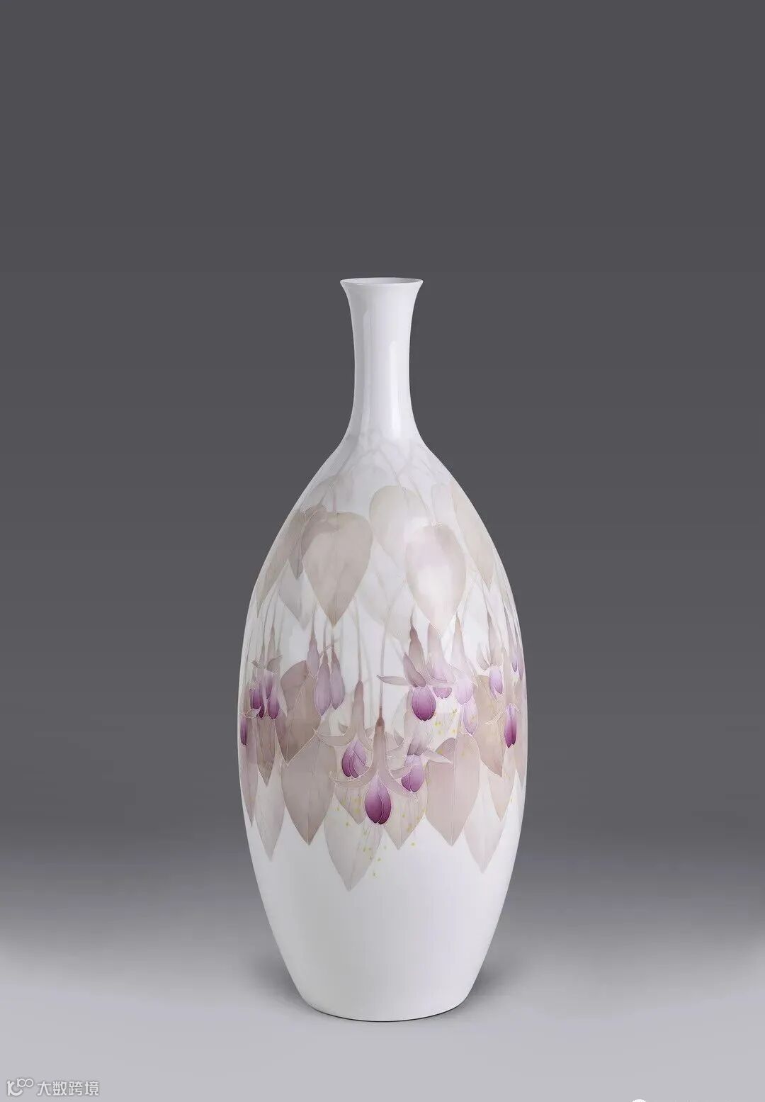 此件作品造型为国家级非遗代表性传承人陈扬龙先生早年设计,撇口、细长颈,腹部微曲修长,脂玉泥制作,醴陵窑核心技艺“薄施淡染”技法绘制。作品用色彩、线条把主观感受呈现为一幅和谐的画面,雅致的灰调是近年的实验成果,亦是心灵的外化。