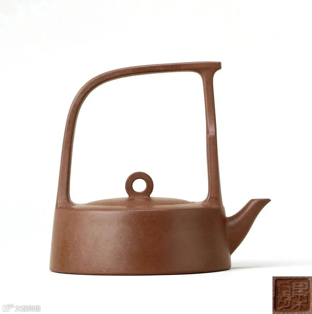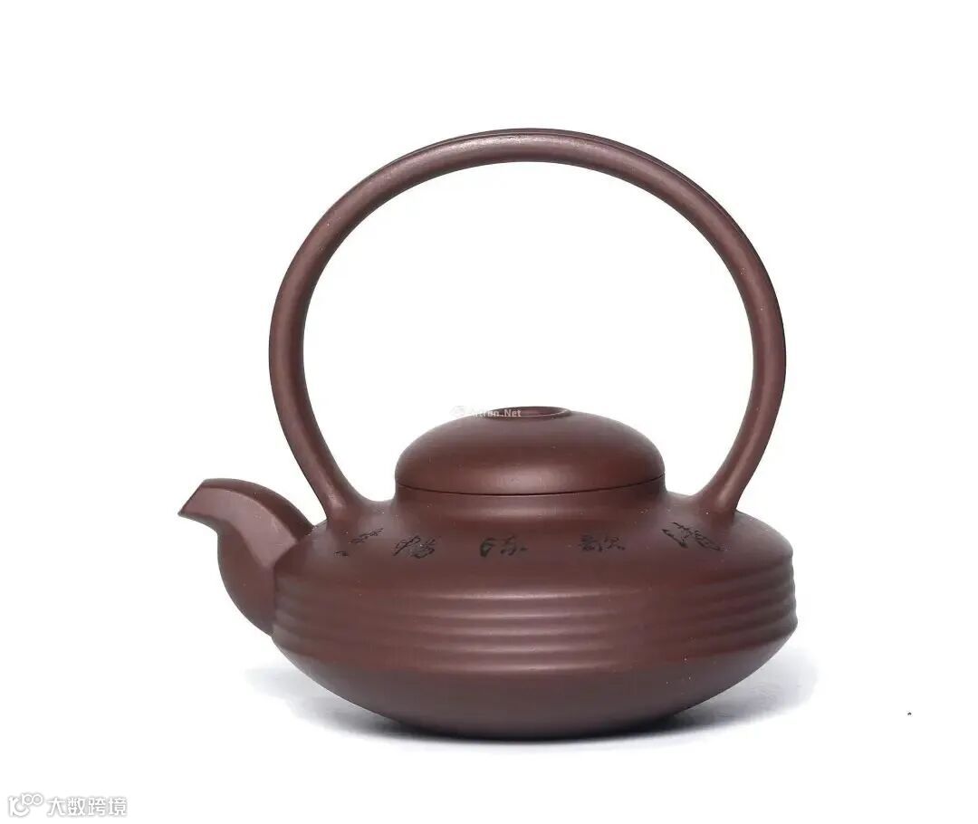 此次鹧鸪提梁壶出自宜兴紫砂工厂陈列室,上世纪90年代由藏家带至台湾。取“鹧鸪”二字有两层深意,一为抽象的形似,表达当时的心情;二为取古代一种名茶,即“金缕鹧鸪斑”之意。这把鹧鸪提梁壶的造型为扁圆形壶身,把手为见棱见方的三柱高提梁,从侧面望去犹如一只飞翔着的鸟儿的头部。器型秀美,端庄。