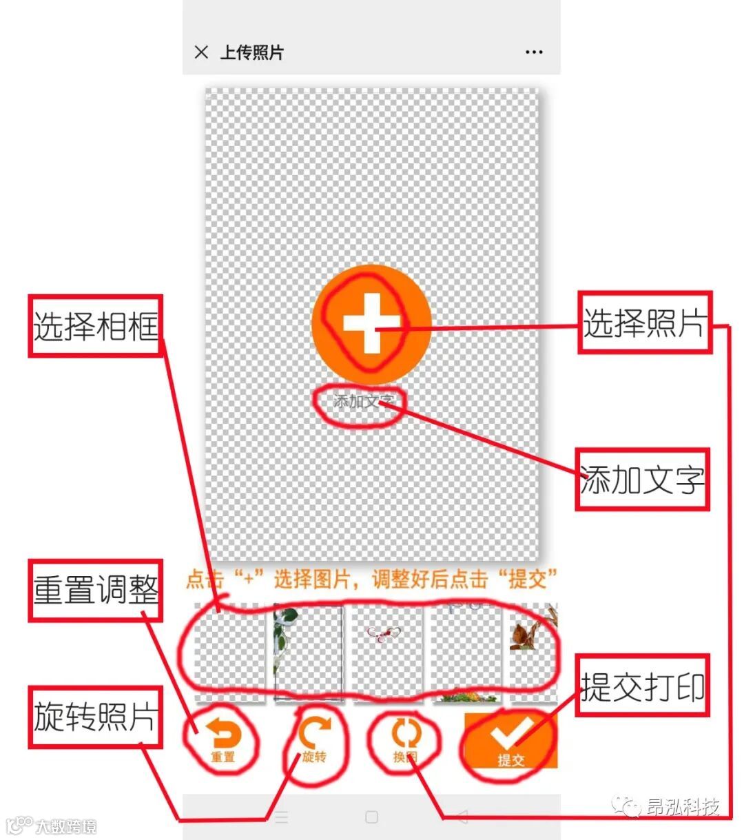 1、点中间的“+”号会出现选择照片的对话框,或者点下方的“换图”可以更换照片;可以添加文字、选择相框、旋转照片;重置调整是恢复照片初始大小、初始位置和默认相框;提交打印是上传照片并开始打印。