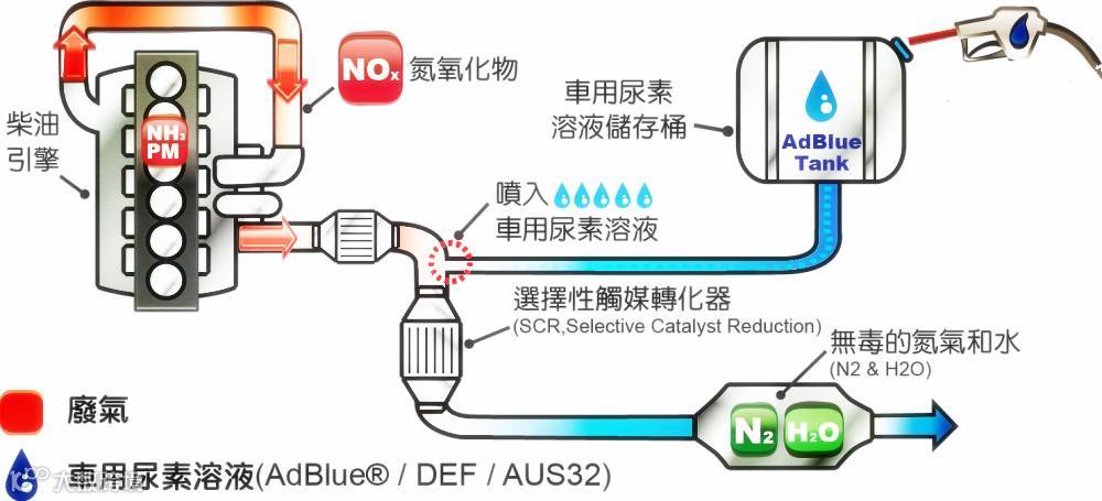 首先在工作原理上,后处理完全不参与汽车的燃烧和传动,尾气从涡轮出来后进入排气管,排气管上安装有尿素计量喷射装置,喷入尿素水溶液,尿素溶液和尾气中的氮氧化合物在SCR反应罐中发生氧化还原反应,生成氮气和水排出。