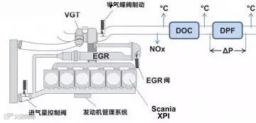 第一种,“EGR+DPF/DOC”,即“废气再循环系统+颗粒捕集器+氧化型催化转化器”。即先通过废气再循环降低燃烧过程中NOx的生成量,再通过颗粒捕集器捕集因采用EGR技术而略有增加的颗粒物,同时使用氧化型催化转化器定期再生颗粒捕集器。
