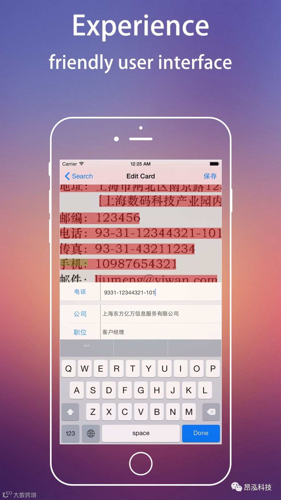 通过手机拍照,后续操作都由软件自动完成,包括找到名片边沿,剪边,摆正,定位各语段位置,对各语段文字由图像转为电子文字,分析各语段含义,将信息保存到通讯录中对应的字段。