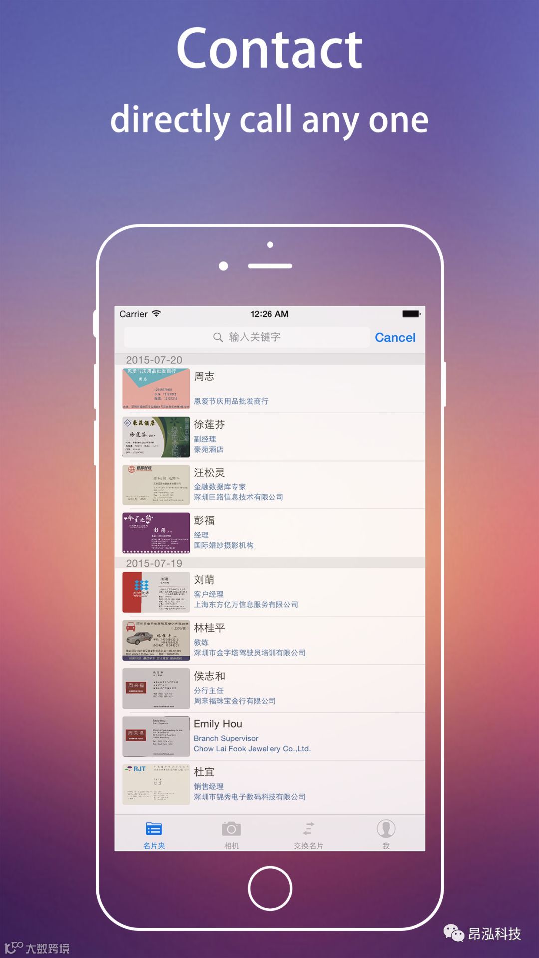 对于名片比较多的商务人士,总会在参加完一个会议或出差回来之后,收到一大堆的名片,逐张录入实在太费时间和精力,并且可能出错,不录入就会错失客户,使用昂泓的名片批量识别,只需对每张名片拍个照,就可以坐等一批新客户进入手机通讯了,软件还支持搜索,让你快速找到客户,不错过一单生意。