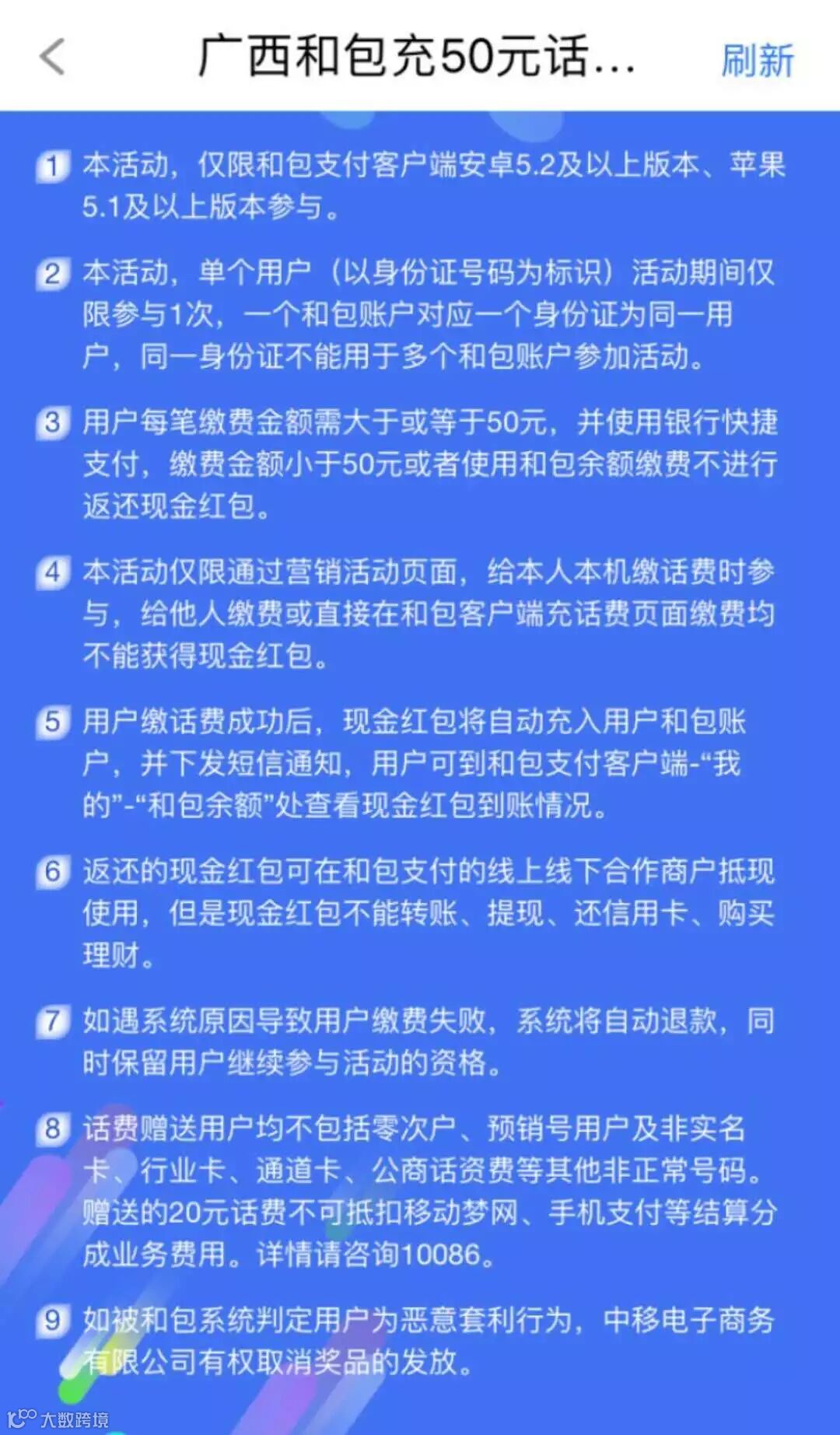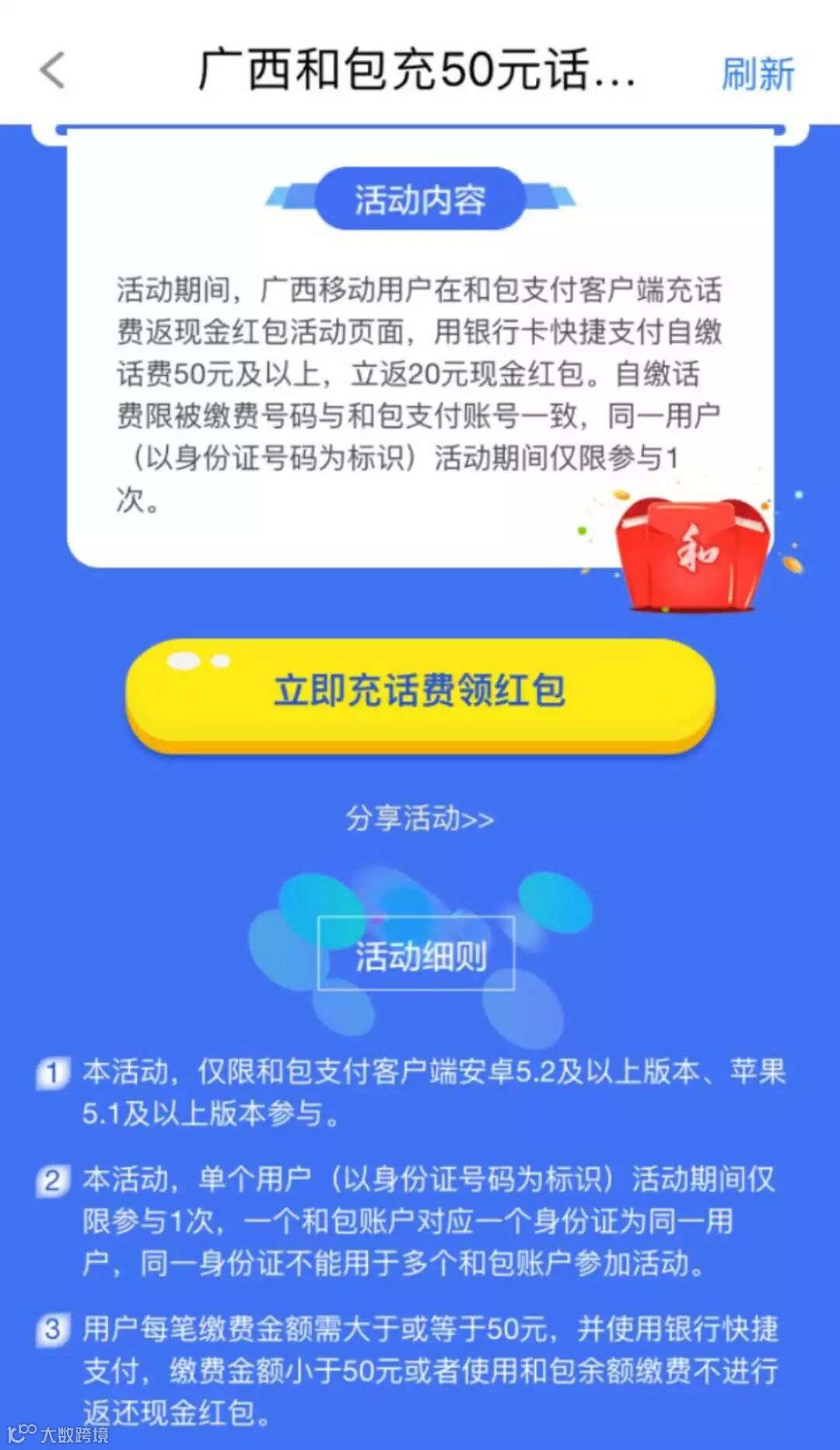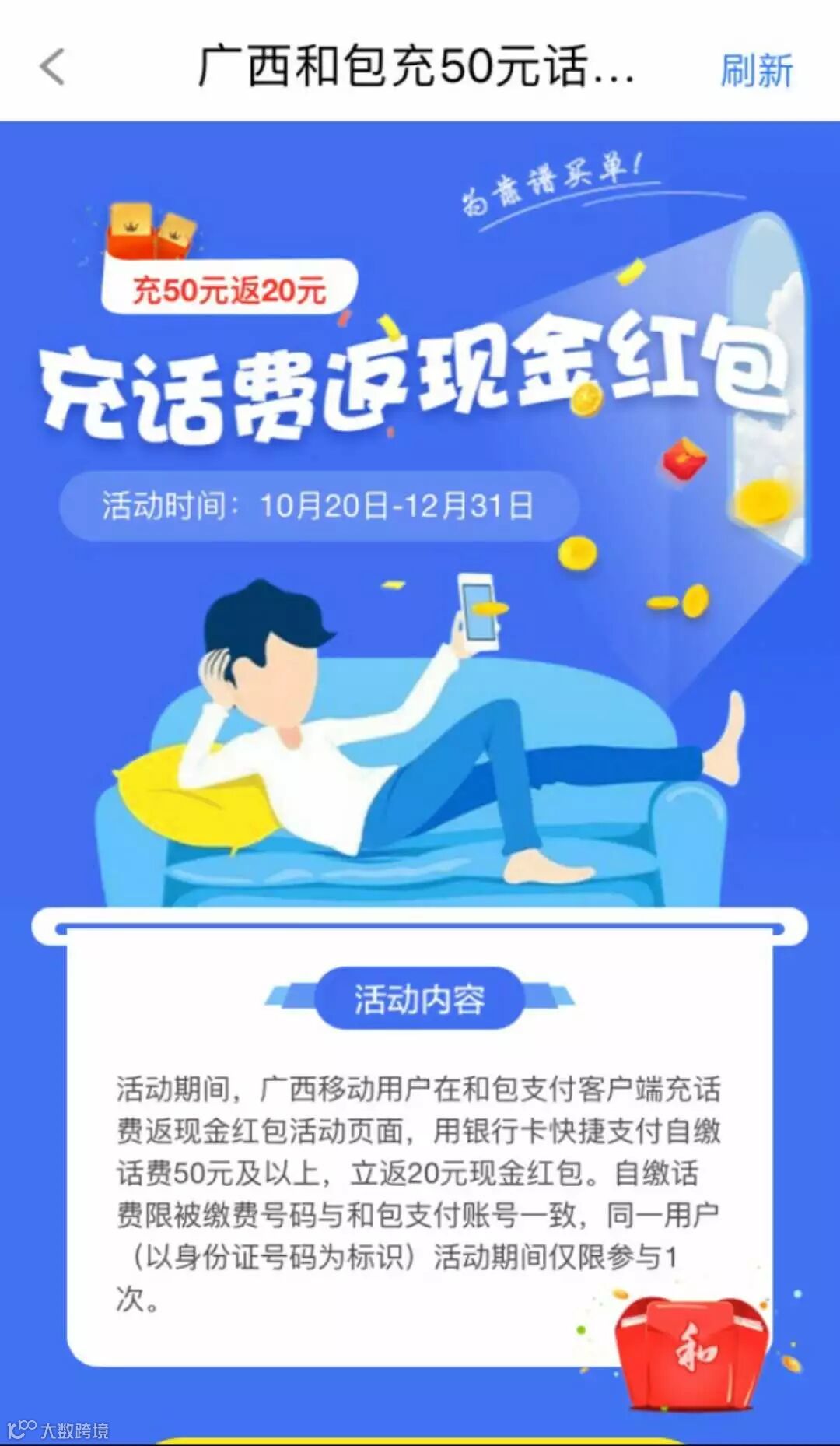 活动内容:活动期间,广西移动用户在和包支付客户端充话费返现金红包活动页面,用银行卡快捷支付自缴话费50元以上,立返20元现金红包,自缴话费限被缴费号码与和包支付账号一致,同一用户(以身份证号码为标识)活动期间仅限参与1次。