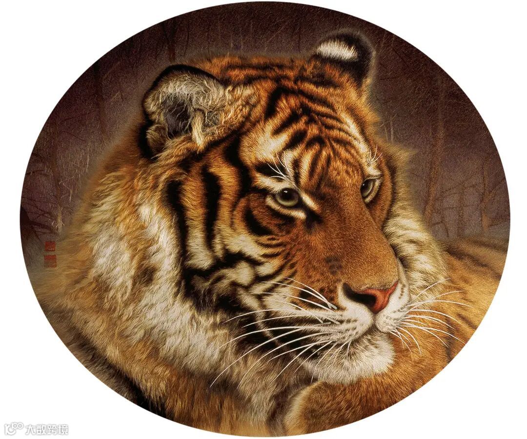 上世纪六十年代,以余振辉为首的湘绣老艺人总结完善了湘绣鬅毛针,并使狮虎成为湘绣传统品牌产品,久享盛誉,至今无出其右。细观狮虎,其形象在施针用线之间,纤毫毕现,变化多端,逼真神似,质感强烈。