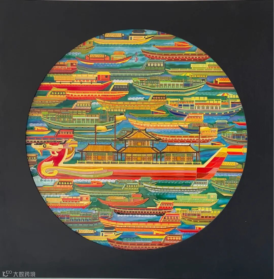 三彩环艺《泱泱》是洛阳隋唐大运河文化博物馆系列环艺作品之一,运用的金属材质延续“波·船”圆弧造型上下排列的形式,并以三彩浮雕瓷片填充,釉色交融,流动自然,水光潋滟,展现出洛阳三彩的写意之美,运河泱泱的壮阔之美。画面上浮现出的舟船图案,寓意中国大运河的五十八个世界遗产点,百舸争流,扬帆起航,仿佛昔日运河漕运川流不息重现眼前。