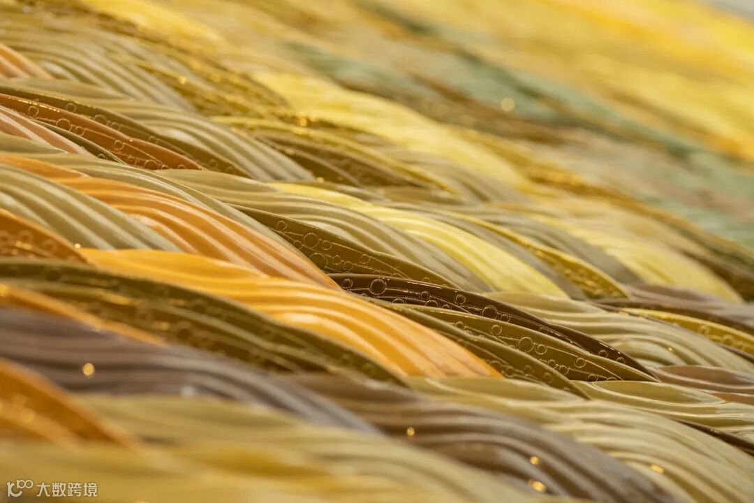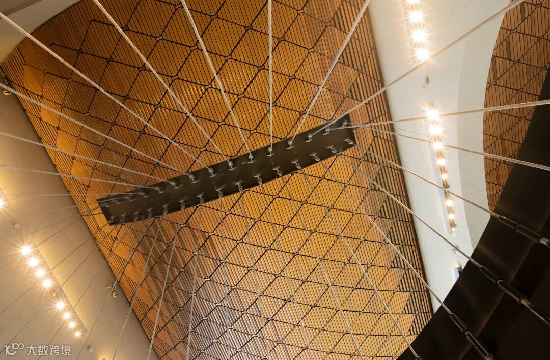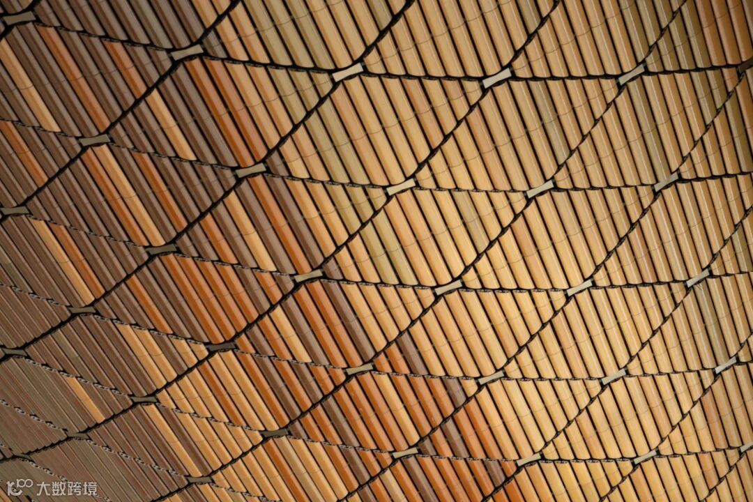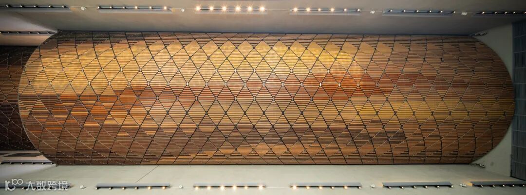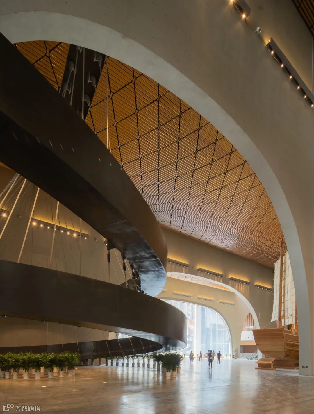 三彩环艺《云帆》由近十三万个陶瓷单元组成,镶嵌于建筑顶部空间,是迄今世界上最大的陶瓷吊顶艺术作品。造型由椭圆陶管拼合成上万个菱形,组成圆弧状穹顶,如云中扬帆,乘风起航,极具立体感与视觉冲击力。其色彩以写意三彩的艺术手法,使观者犹如仰视流淌的大运河壮阔之美,阳光洒落,万帆竞渡,波光荡漾。游客穿梭于博物馆内,感受大运河穿越时空的魅力。长风破浪会有时,直挂云帆济沧海!