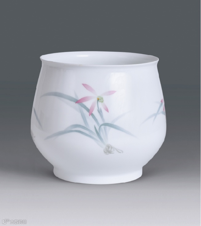 此件兰草钵,取稀有高岭土,选料上乘。型质温文尔雅,口沿外撇,腹下渐扩,胎体轻盈坚质,光亮清澈,外壁装饰四朵兰草,形态各异,以独创“薄施淡染”工艺绘制,浓淡相宜。