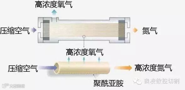 该装置的原理,就是利用了特殊的滤芯,这种滤芯的特性,就是氧气通过率比氮气要高得多。把压缩空气注入滤芯后,将氧气排放至外膜外,其结果就是,从滤芯出口处得到的,就是充满氮气的气体了。
