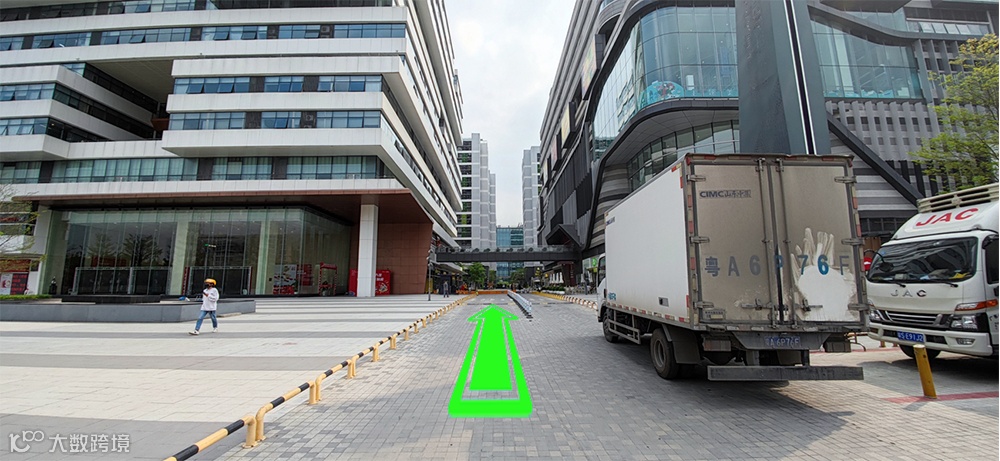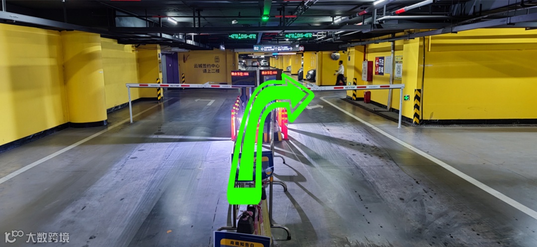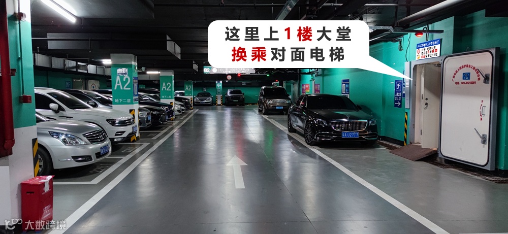 行驶到柱子为青绿色区域,即为A2栋。箭头指向区域即为电梯厅,进入电梯后按1楼上到一楼大堂,换乘对面电梯。