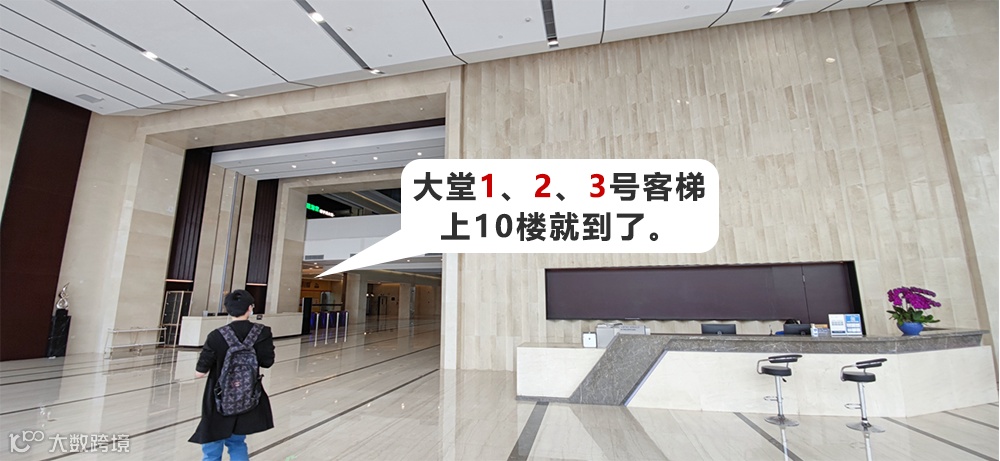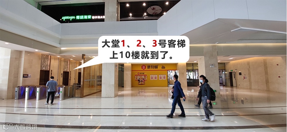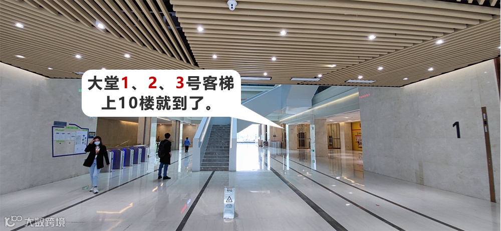 上到大堂后,换乘对面1、2、3号客梯均可到达10楼(我司)。