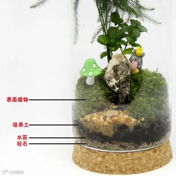 在微景观中的水苔层主要作用是吸水、保水和透气,把轻石层部分的水分吸收提供种植土层,以保证植物生长需要;另外水苔层也起到了隔断轻石层和种植土的作用,保持微景观的美观。