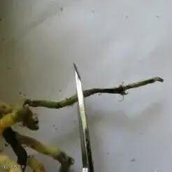 将蝴蝶兰根系上的旧水苔轻轻拆掉,小心不要弄断好根,把腐烂的根剪掉。